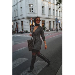 70% polyester 27% wiskoza 3% elastan MATERIÁL Tkanina: Tkanina s krajkovými detaily PODROBNOSTI O PRODUKTU Výstřih: Hluboký výstřih do V Rukávy: Dlouhé Zapínání: Zapíná se na vnitřní skrytý knoflík a vnější ozdobný knoflík Kapsy: Žádné Podšívka: Ne Vzor: Mélange Detaily: Ozdobný zlatý knoflík v pase, krajková vsadka ve spodním lemu Model: M871 Navrženo a vyrobeno v Polsku Modelka na fotografii měří 171 cm a má na sobě velikost S Střih a střih Střih: Lehce přizpůsobený Tvar: Zavinovací přední díl s ohraničeným pasem Délka: Mini
