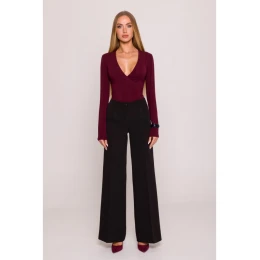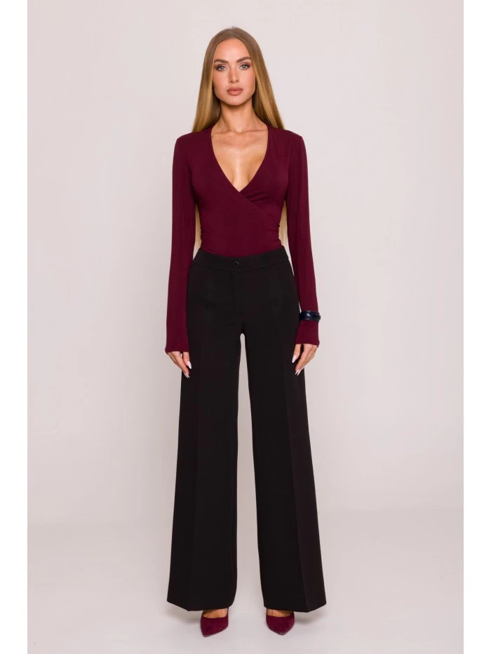 materiál: 95% polyester 5% elastan Tkanina: Hladká tkanina s matnou úpravou PODROBNOSTI O PRODUKTU Pas: Střední pas Zapínání: Knoflík vpředu a skrytý zip Kapsy: Boční kapsy Nohy: Dlouhé, široké nohavice s lisovanými záhyby Podšívka: Bez podšívky Model: M875 Navrženo a vyrobeno v Polsku Modelka na fotografii měří 171 cm a má na sobě velikost S Střih a střih Střih: Klasický střih se širokou siluetou Tvar: Přiléhavý v pase a na bocích, volný od stehen dolů Délka: Po zem