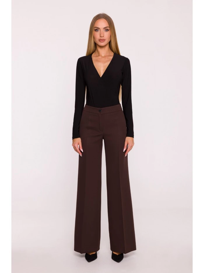 materiál: 95% polyester 5% elastan Tkanina: Hladká tkanina s matnou úpravou PODROBNOSTI O PRODUKTU Pas: Střední pas Zapínání: Knoflík vpředu a skrytý zip Kapsy: Boční kapsy Nohy: Dlouhé, široké nohavice s lisovanými záhyby Podšívka: Bez podšívky Model: M875 Navrženo a vyrobeno v Polsku Modelka na fotografii měří 171 cm a má na sobě velikost S Střih a střih Střih: Klasický střih se širokou siluetou Tvar: Přiléhavý v pase a na bocích, volný od stehen dolů Délka: Po zem
