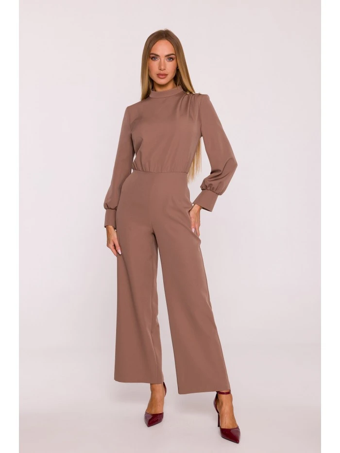 materiál: 95% polyester 5% elastan Tkanina: hladká tkanina s matným povrchem PODROBNOSTI O PRODUKTU Výstřih: stojáček s jemným řasením na ramenou Rukávy: dlouhé, zakončené širokými manžetami s rozparkem Zapínání: skrytý zip na zádech Kapsy: žádné Nohy: široké, 7/8 délka Podšívka: žádná Detaily: ozdobné knoflíky na rameni Vzor: hladký Model: M879 Navrženo a vyrobeno v Polsku Modelka na fotografii měří 171 cm a má na sobě velikost S STYL A STŘIH Styl: elegantní, ženský Tvar: mírně vypasovaný top s řasením, vypasovaný pas, široké nohavice Délka: jednodílný overal, 7/8 délka nohavic