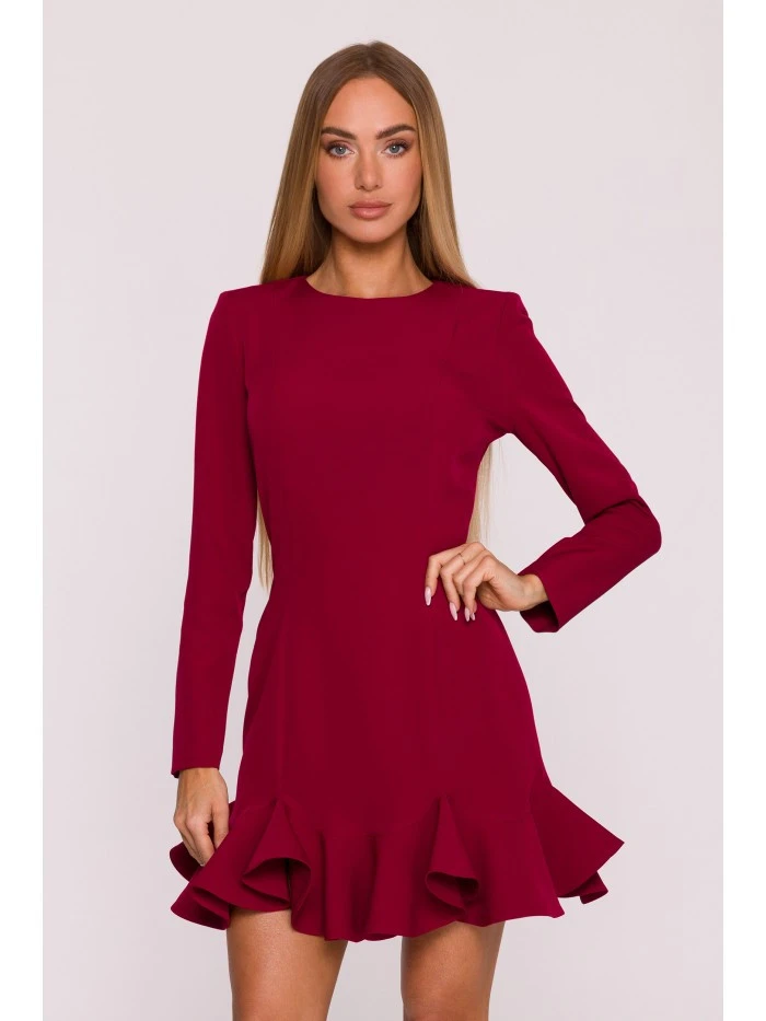 materiál: 95% polyester 5% elastan Tkanina: hladká tkanina s matným povrchem PODROBNOSTI O PRODUKTU Výstřih: klasický, kulatý Rukávy: dlouhé Zapínání: skrytý zip na zádech Kapsy: žádné Podšívka: žádná Detaily: ozdobný volánek na lemu Model: M880 Navrženo a vyrobeno v Polsku Modelka na fotografii měří 171 cm a má na sobě velikost S STYL A STŘIH Styl: mírně vypasovaný Tvar: rovný, mírně vypasovaný živůtek s tvarujícími švy, rozšířená sukně s volánkovým lemem Délka: mini