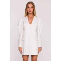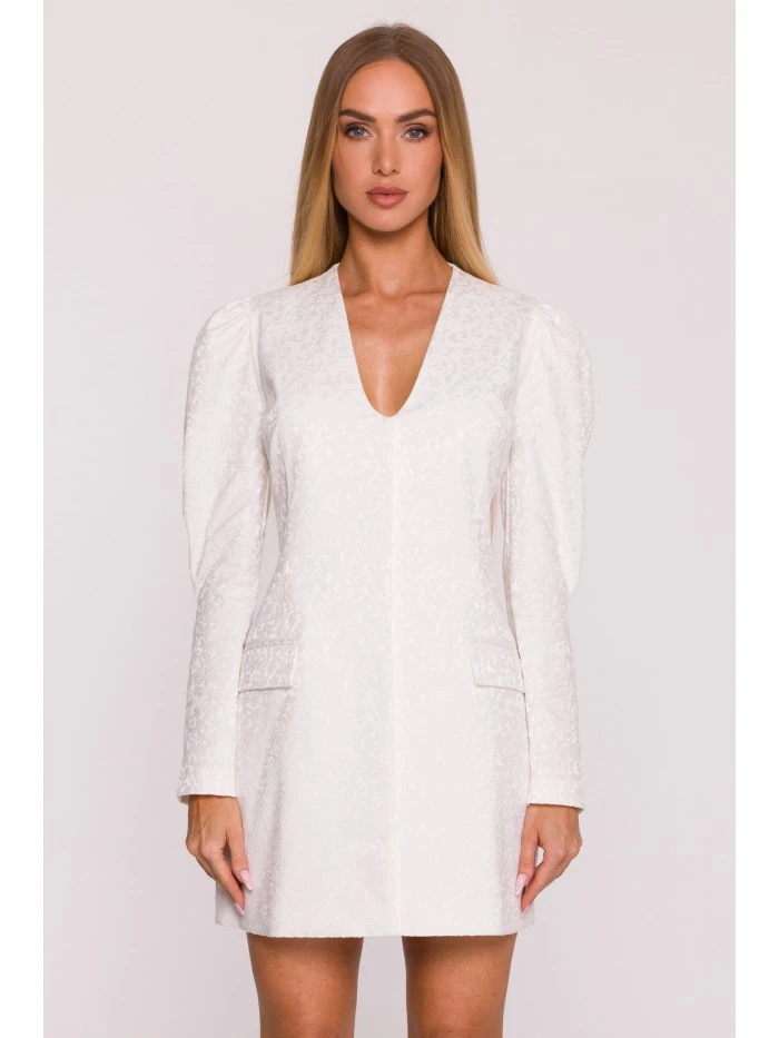 HLAVNÍ LÁTKA: 50% bavlna 47% polyester 3% elastan PODŠÍVKA: 100% polyester MATERIÁL Látka: žakárová tkanina s botanickým vzorem. PODROBNOSTI O VÝROBKU Výstřih: hluboký výstřih do V Rukávy: dlouhé, na ramenou mírně nabrané Zapínání: vpředu rozepínání na knoflíky skryté pod légou Kapsy: falešné kapsy, ozdobné klopy Podšívka: plně podšitá Model: M881 Navrženo a vyrobeno v Polsku Modelka na fotografii je vysoká 171 cm a má na sobě velikost S STYL A STŘIH Styl: vypasovaný, mírně přizpůsobený Tvar: klasický, s výraznou horní částí těla a rovnou sukní Délka: mini