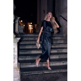 97% polyester 3% elastan MATERIÁL Tkanina: satén - hladký, lesklý PODROBNOSTI O PRODUKTU Výstřih: lodičkový výstřih Rukávy: krátké, volné Sukně: zavinovací ve stylu pareo zavazující se kolem pasu Zapínání: zavazování v pase Podšívka: žádná Model: M887 Navrženo a vyrobeno v Polsku Modelka na fotografii měří 171 cm a má na sobě velikost S STYL A STŘIH Styl: elegantní saténové midi šaty Tvar: volný top, který lze zastrčit do sukně nebo nosit přes ni, zavinovací sukně ve stylu pareo zavazující se kolem pasu Délka: midi