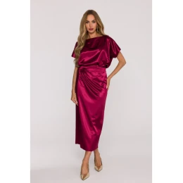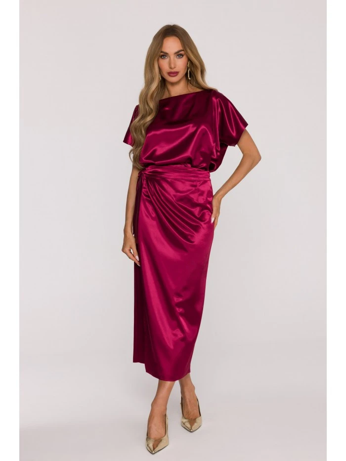 97% polyester 3% elastan MATERIÁL Tkanina: satén - hladký, lesklý PODROBNOSTI O PRODUKTU Výstřih: lodičkový výstřih Rukávy: krátké, volné Sukně: zavinovací ve stylu pareo zavazující se kolem pasu Zapínání: zavazování v pase Podšívka: žádná Model: M887 Navrženo a vyrobeno v Polsku Modelka na fotografii měří 171 cm a má na sobě velikost S STYL A STŘIH Styl: elegantní saténové midi šaty Tvar: volný top, který lze zastrčit do sukně nebo nosit přes ni, zavinovací sukně ve stylu pareo zavazující se kolem pasu Délka: midi
