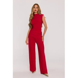 95% polyester 5% elastane MATERIAL Material: smooth knit – soft, elastic, and comfortable to wear PRODUCT DETAILS Top: sleeveless, with a mock turtleneck, fitted, featuring draping and an asymmetrical hem Trousers: long, wide-leg, pleats at the waistband, loose cut Fastening: top without fastening, pulled over the head; trousers with concealed zip at the back Pockets: side Lining: none Model: M890 Designed and made in Poland The model in the photo is 171 cm tall and is wearing size S STYLE & CUT Style: two-piece set – asymmetrical draped top + wide-leg trousers Shape: top enhances the silhouette with draping, trousers elongate the legs and balance proportions Length: full-length trousers, top covering the hips