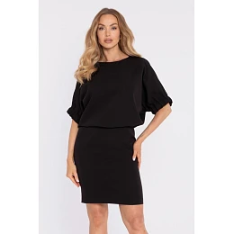 95% polyester 5% elastane MATERIAL Smooth woven fabric with a matte finish. PRODUCT DETAILS Neckline: front – round and modest; back – deeper vertical slit fastened with a single button. Sleeves: short, puff sleeves finished with elastic cuffs. Waist: subtly defined thanks to the blouson-style top. Skirt: straight, slightly fitted, with a short back slit. Closure: single button at the back neckline; concealed zip at the back. Pockets: none. Lining: none. Model: M904. Designed and made in Poland. The model in the photo is 171 cm tall and is wearing size S. FIT AND CUT Style: elegant, minimalist mini dress with a relaxed top and puff sleeves. Shape: oversized, blouson-like upper part; straight, lightly fitted skirt. Length: mini.