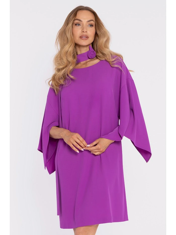 95% polyester 5% elastane MATERIAL Fabric: smooth fabric with a subtle sheen. PRODUCT DETAILS Neckline: boat / modest round-boat shape – subtly highlights the neckline. Sleeves: wide, relaxed kimono/cape-style sleeves – fluid and statement-making. Waist: defined with a belt (separate piece, included with the dress) Skirt: straight, easy fit with a subtle A-line feel. Closure: none, slip-on style (pulled on over the head). Pockets: none. Lining: none. Model: M908. Designed and made in Poland. The model in the photo is 171 cm tall and is wearing size S. FIT AND CUT Style: minimalist dress with wide sleeves and a matching belt. Shape: relaxed kimono top, waist shaped with the belt, clean straight skirt. Length: above the knee.