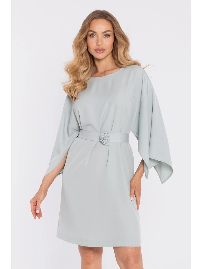 95% polyester 5% elastane MATERIAL Fabric: smooth fabric with a subtle sheen. PRODUCT DETAILS Neckline: boat / modest round-boat shape – subtly highlights the neckline. Sleeves: wide, relaxed kimono/cape-style sleeves – fluid and statement-making. Waist: defined with a belt (separate piece, included with the dress) Skirt: straight, easy fit with a subtle A-line feel. Closure: none, slip-on style (pulled on over the head). Pockets: none. Lining: none. Model: M908. Designed and made in Poland. The model in the photo is 171 cm tall and is wearing size S. FIT AND CUT Style: minimalist dress with wide sleeves and a matching belt. Shape: relaxed kimono top, waist shaped with the belt, clean straight skirt. Length: above the knee.