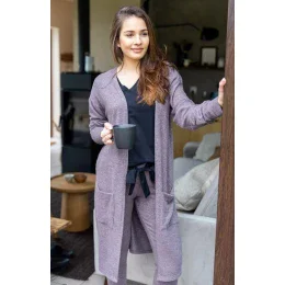 Hřejivý dlouhý svetr z měkkého úpletu volného, pohodlného střihu - lze použít i jako svetr. Bez vázání v pase. dlouhé rukávy. dvě kapsy na bocích. příjemné, velmi ženské barvy. 52 % viskóza, 26 % polyester, 22 % polyamid.
