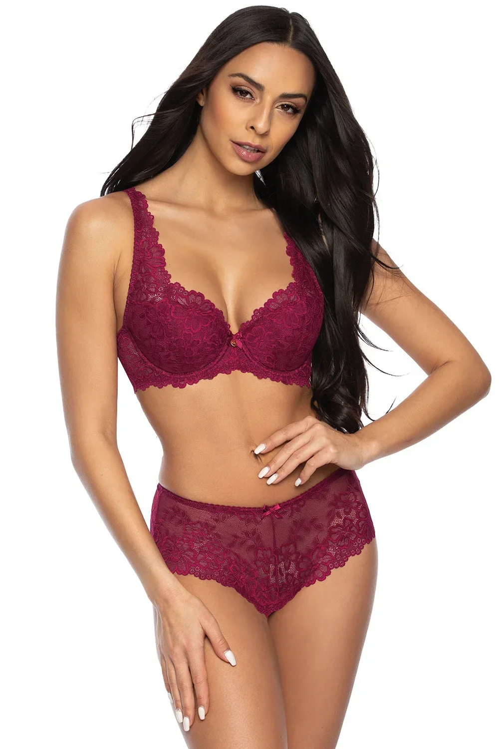 Podprsenka značky Mat, model 053/22 Carmela. Má drátky, které podpírají prsa a vhodně je tvarují. Výrobek má nastavitelná ramínka bez možnosti jejich odepnutí. Podprsenka se zapíná na háčky. Místo zapínání: na zádech. 2 řady svislých výšivek. 3 stupně vodorovných výšivek. Výrobek je vyroben ze 44 % polyamidu, 17 % bavlny, 17 % polyesteru, 17 % polyuretanu, 5 % elastanu. Vlastnosti výrobku: krajkový ženský krásný elegantní.