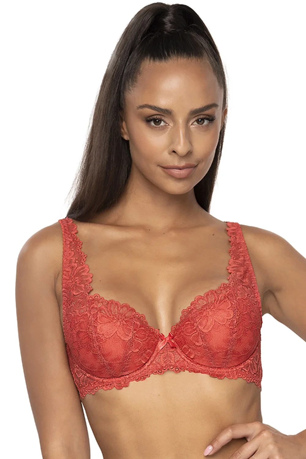 Podprsenka značky Mat, model 053/22 Carmela. Má drátky, které podpírají prsa a vhodně je tvarují. Výrobek má nastavitelná ramínka bez možnosti jejich odepnutí. Podprsenka se zapíná na háčky. Místo zapínání: na zádech. 2 řady svislých výšivek. 3 stupně vodorovných výšivek. Výrobek je vyroben ze 44 % polyamidu, 17 % bavlny, 17 % polyesteru, 17 % polyuretanu, 5 % elastanu. Vlastnosti výrobku: krajkový ženský krásný elegantní.