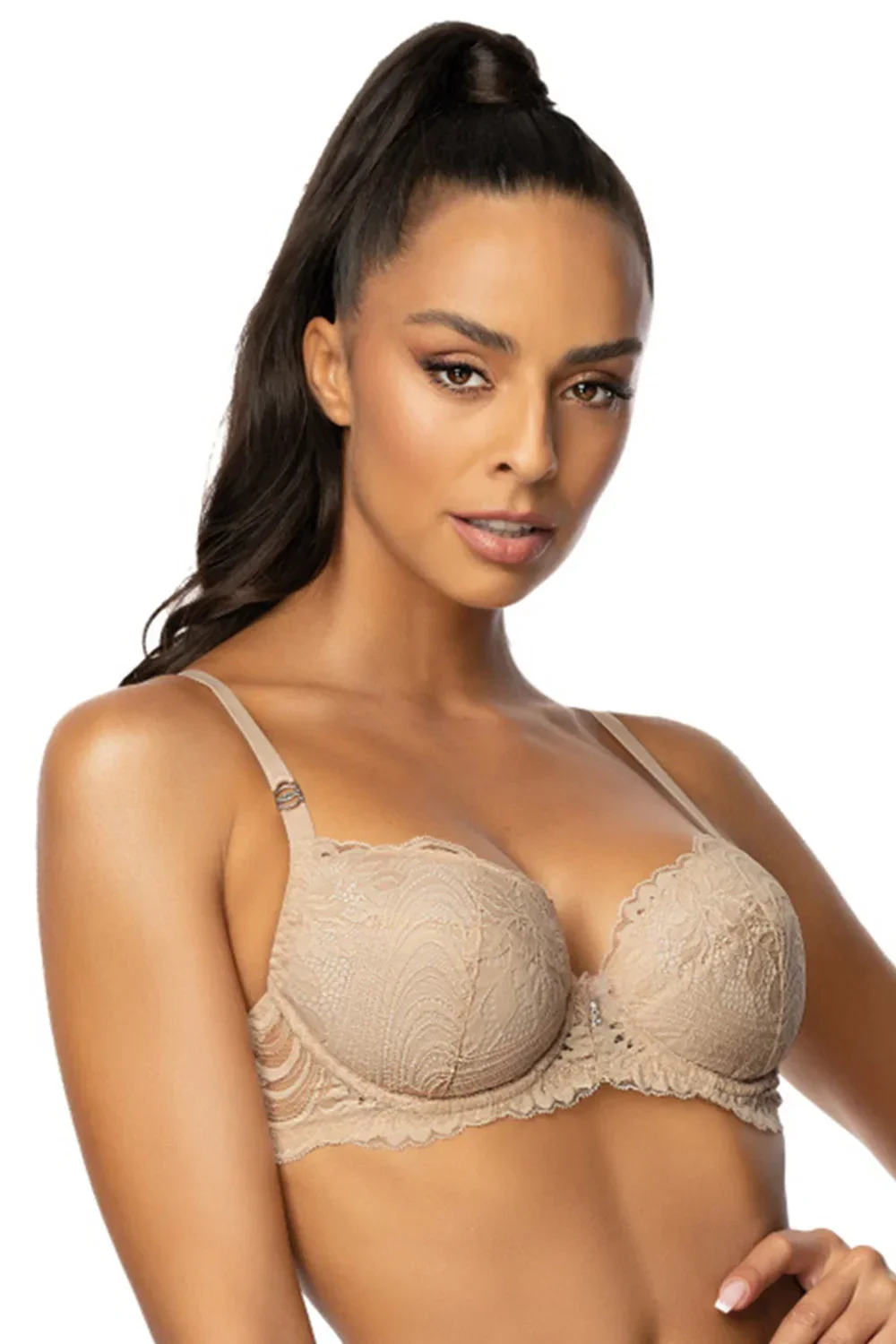 Podprsenka značky Mat, model 3635/11 Darlene. Má drátky, které podporují prsa a správně je tvarují. Výrobek má nastavitelná ramínka bez možnosti jejich odepnutí. Podprsenka má zapínání na háčky a očka. Místo zapínání: na zádech. Výrobek je vyroben z 28 % polyamidu, 25 % bavlny, 21 % polyesteru, 23 % polyuretanu, 3 % elastanu. Výrobek má kapsy na vložky. Dámský výrobek.