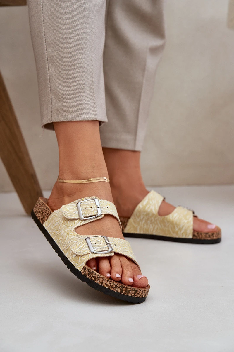 Materiálové pantofle na korkové podrážce s přezkami žluté Atera