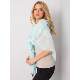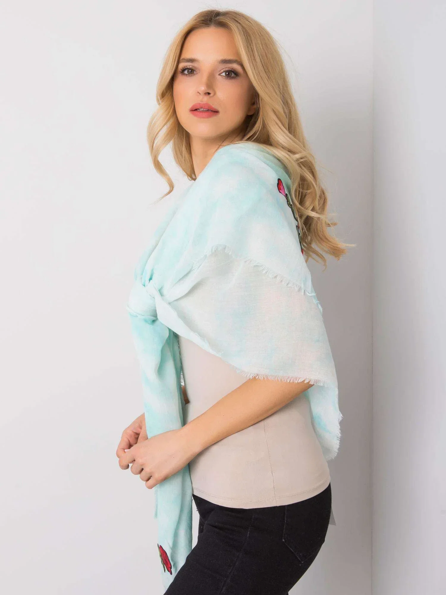 Dámská šála mentolové barvy s barevnými nášivkami.