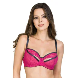 Košíčky jsou vyrobené z tylu. Vnější strana košíčků je ve spodní části pokrytá růžovou puntíkovanou síťovinou. Vrchní část košíčků pokrývá pěkná výšivka s květinovým motivem. Švy jsou zakryté páskou v grafitové barvě. Můstek je ušitý ze síťoviny zpevněné stabilním tylem. Zadní díly modelu tvoří růžové mikrovlákno. Délku ramínek je možné nastavit. Šířka ramínek je přizpůsobená velikosti košíčků a délce obvodu, a proto je podprsenka při nošení pohodlná a komfortní. Krajka a doplňky jsou vyrobené z velmi kvalitních francouzských materiálů.