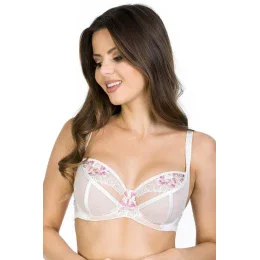 Košíčky modelu jsou ušité z tylu. Prošití košíčků překrývají saténové pásky. Vrchní část košíčků zdobí krajka. Také obvod podprsenky je ozdobený krajkou. Podprsenka je k dostání v jemné smetanové barvě.