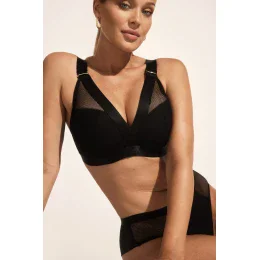 Měkké košíčky ze síťoviny jsou podšité tenkou houbičkou. Výstřih, ramínka a spodní okraj modelu tvoří široká pružná guma. Ramínka mají ve přední části čtyřstupňovou možnost nastavení délky. Díky dokonalému střihu a konstrukci podprsenka stabilně nadnáší poprsí a poskytuje mu oporu i při intenzivní fyzické námaze a aktivitě.