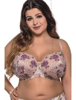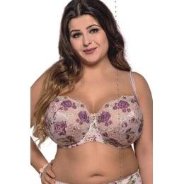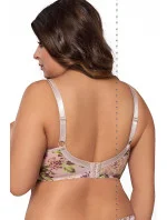 Krásná měkká podprsenka v podzimních barvách - světlé růžové spojené s vřesovou fialovou a zelenou.Košíčky tohoto modelu krásně obepínají poprsí a udržují jej na správném místě. Zároveň vytváří krásný dekolt, který zvýrazňují.Spodní část košíčků je vyrobená z pevnější látky potištěné květinovým motivem. Horní část košíčků pokrývá výšivka, která je podšitá jemnou síťovinou. Můstek tvoří stejná látka, která byla použita na spodní část košíčků. Boky jsou ušité z pružné lycrové látky, která je taktéž potištěná květinovým vzorem a která se při nošení nevytahuje.Ve středu podprsenky, mezi košíčky, je umístěná mašlička s ozdobným přívěskem.Ramínka tohoto modelu je možné nastavit, ale nelze je odepnout. Jejich šířka závisí na rozměru a velikosti podprsenky. V místech, kde se ramínka spojují s košíčky, jsou umístěné malé mašličky a ramínka zdobí aplikace z plastické krajky ve tvaru bublinek.Model je doplněný o svislé boční kostice a zapíná se na dvou nebo třířadové háčky (v závislosti na rozměru) s třístupňovou možností nastavení obvodu.Složení: 90 % polyamid, 7 % elastan, 3 % polyester.