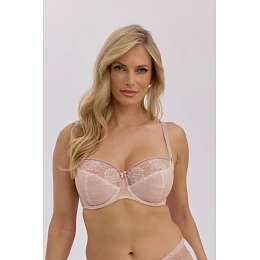 Měkká podprsenka Yesenia Art. 1353 je kvintesencí jemnosti a ženské elegance. Je vyrobena z husté ažurové krajky v jemném odstínu moka a potěší jemným vzorem a měkkým povrchem. Měkká struktura bez vycpávek zaručuje přirozenou polohu poprsí a zároveň poskytuje dokonalou oporu díky velrybím kosticím a preciznímu střihu. Průhledná horní část košíčků dodává lehkost a půvabná mašlička s ozdobným detailem na můstku podtrhuje romantický charakter prádla. Model je ideální pro ženy, které ocení jemnost, pohodlí a styl.