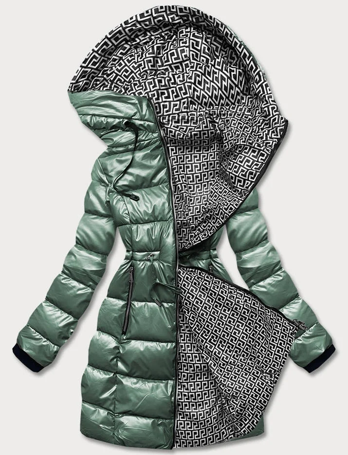 Bunda je zateplená syntetickou péřovou výplní, má dvě kapsy a zapíná se dvousměrným zipem. Model má kapuci, kterou není možné odepnout. Na koncích rukávů jsou skryté stahovací lemy. Bundu je možné v pase stáhnout. Model má délku do poloviny stehen.