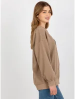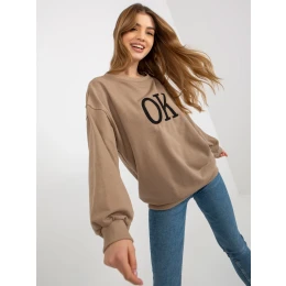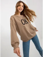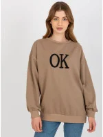 Tmavě béžová volná mikina s kapucí a nápisem .