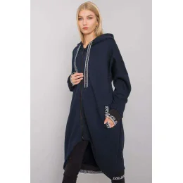 Dámská tmavě modrá prodloužená mikina na zip. Mikina má kapuci a nakládané kapsy.