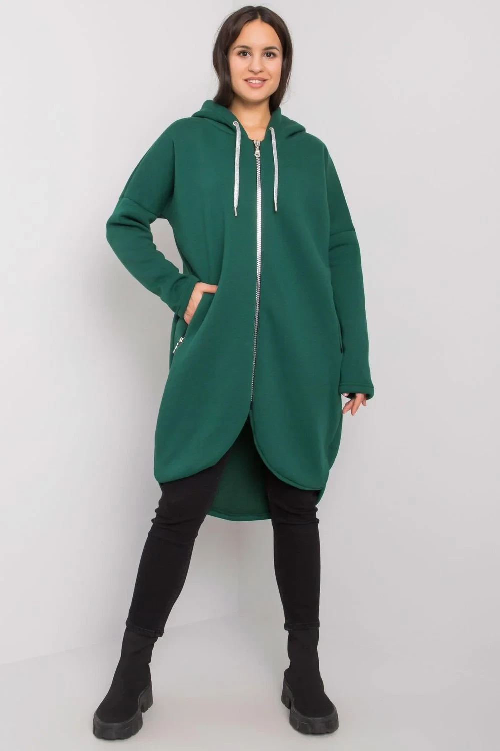 Dámská mikina s prodlouženým střihem a dlouhými rukávy. Mikina má asymetrickou spodní část, zapínání na zip a kapuci. Kapsy na zip po stranách.