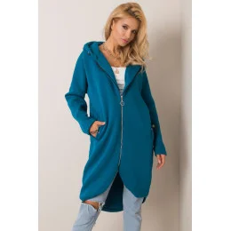 Mikina s prodlouženým střihem a zapínáním na zip. Mikina s dlouhým rukávem a kapucí. Kapsy na bocích.