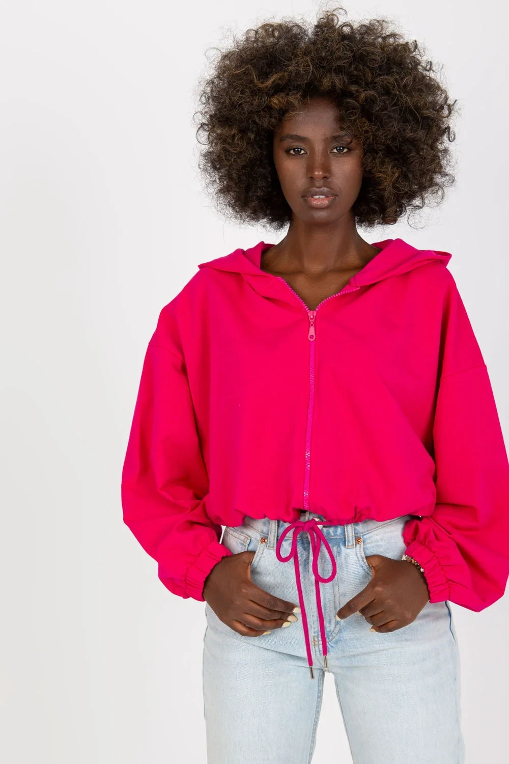 Dámská krátká mikina s dlouhým rukávem a zapínáním na zip. Mikina s kapucí, stahovací šňůrka na spodním lemu.