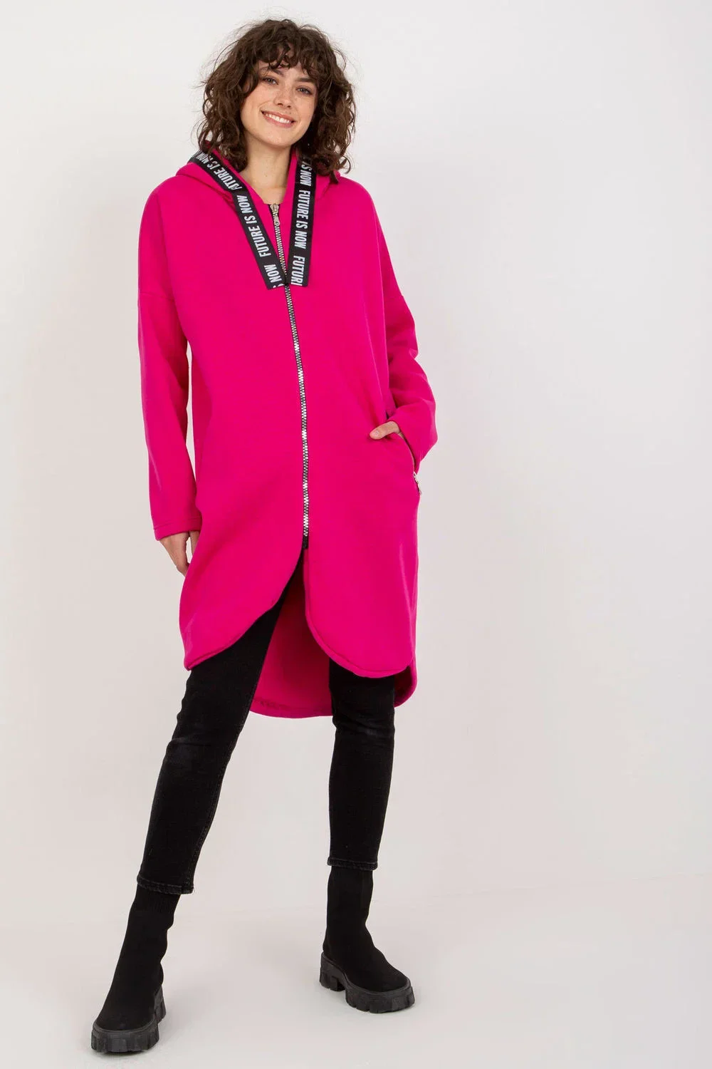Dámská mikina s prodlouženým střihem, dlouhými rukávy a kapucí. Mikina se zapíná na zip a po stranách má kapsy na zip.