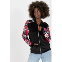 Velurová bunda bomber na zip s kapsami na bocích. Dlouhé rukávy z barevné květinové látky.