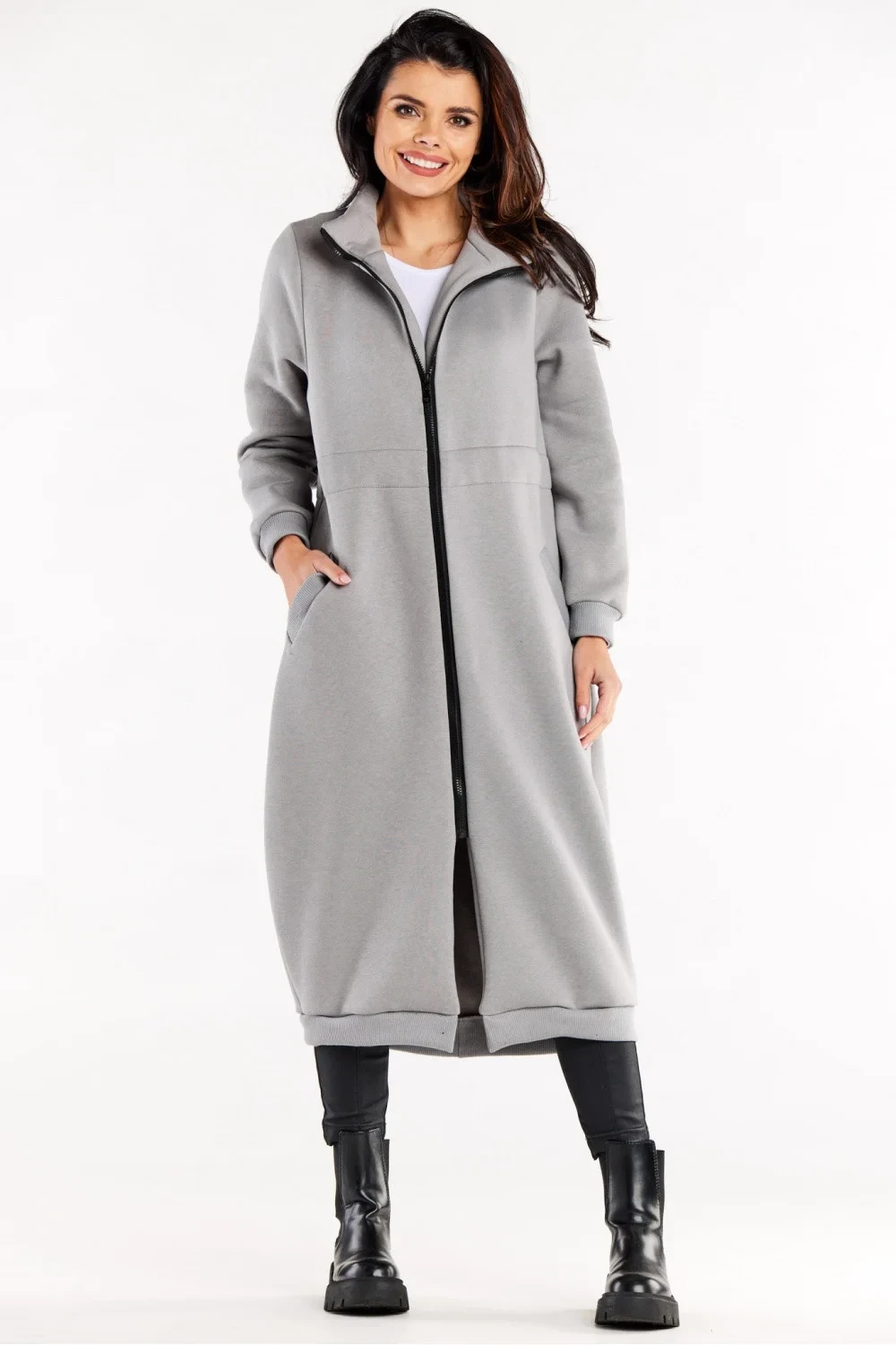 Dlouhá mikina na zip s dlouhými rukávy a vysokým límcem. Mikina má nakládané kapsy. Mikina má v pase tunýlek se stahovací šňůrkou na zádech.