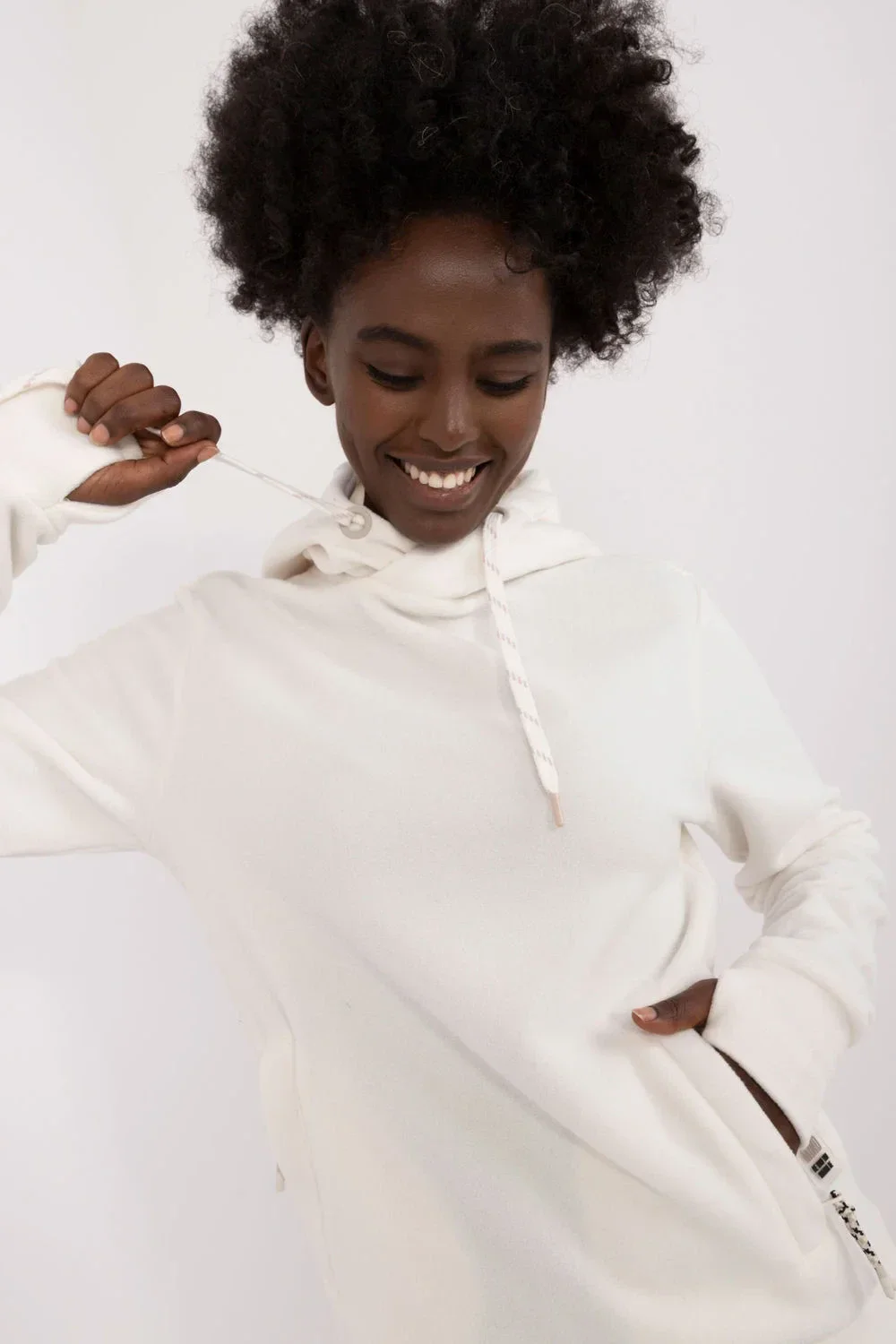 Dámská mikina s kapucí, ideální na chladnější dny. Vyrobená z hladkého materiálu, poskytuje pohodlí a teplo díky dodatečnému vybavení. Mikina má standardní délku a dlouhý rukáv, což ji činí univerzálním prvkem šatníku. Praktické vložené kapsy na zip jsou ideální pro ukládání drobných věcí. Kapuce se šňůrkami umožňuje regulaci a dodatečnou ochranu před větrem. Je to ideální volba pro každodenní outfit, zajišťující pohodlí a funkčnost.