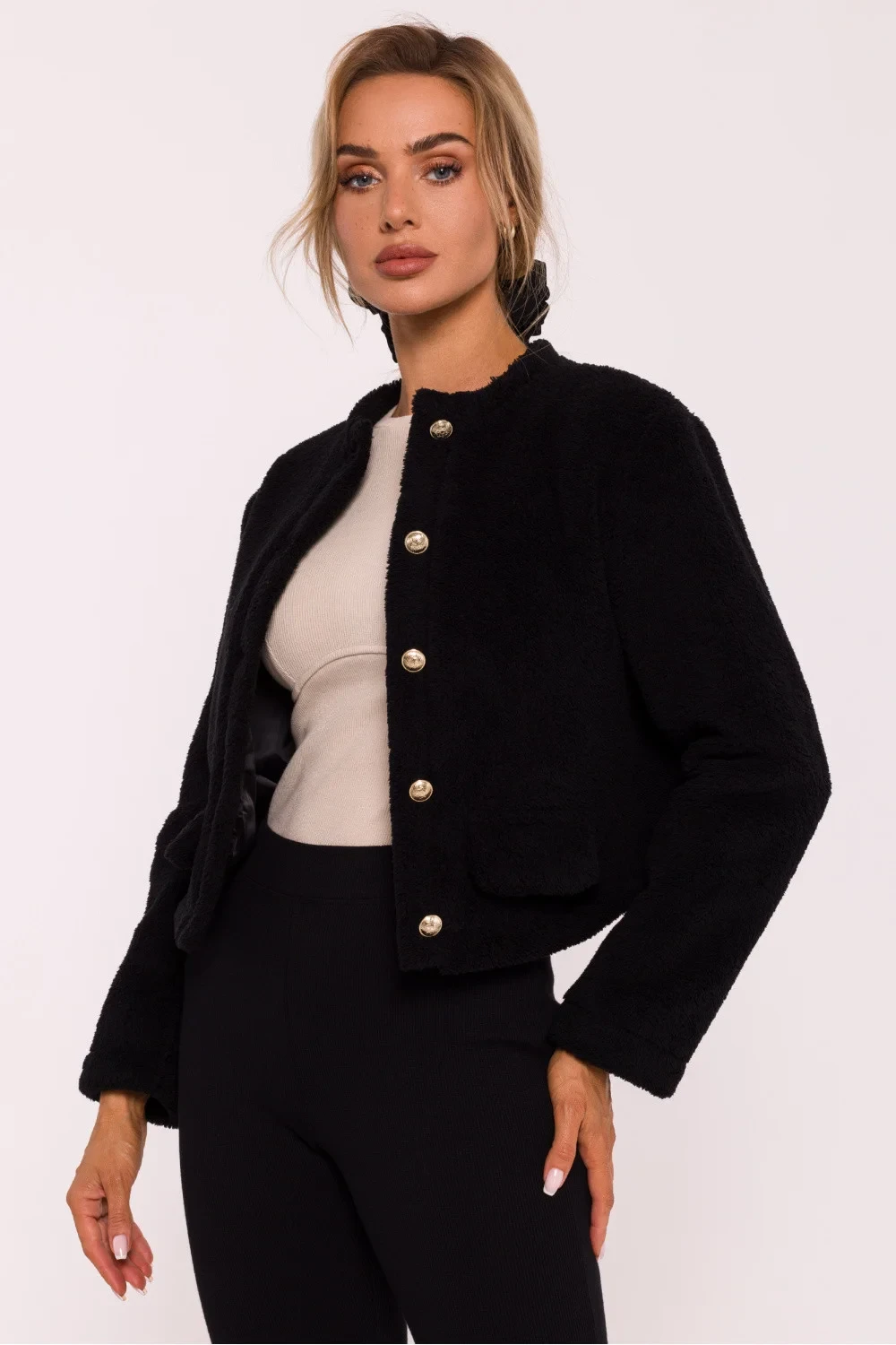 Dámská mikina vyrobená z plyšového materiálu, s krátkým a přímým střihem, ideální pro každodenní styling. Přední část se zapíná dekorativními zlatými knoflíky, které dodávají eleganci. Ozdobné kapsy na přední straně dodávají mikině unikátní charakter. Celá mikina je vybavena podšívkou, která zajišťuje pohodlné nošení. Mikina je navržena a ušita v Polsku a kombinuje styl a pohodlí.