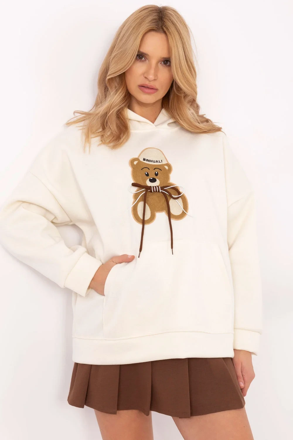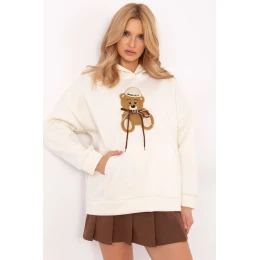 Dámská mikina s unikátním designem, ideální na každý den. Vyrobená z odolného a měkkého polyesteru, poskytuje pohodlí nošení a snadnou údržbu. Model s standardní délkou a dlouhými rukávy skvěle doplní každý outfit. Mikina je vybavena praktickou kapucí, která dodává sportovní charakter a ochranu před chladem. Na přední straně mikiny jsou roztomilé aplikace ve tvaru medvídka, které přidávají zábavný a originální akcent. Kapsa typu klokanka na přední straně přidává funkčnost, umožňuje uložení drobností nebo zahřátí rukou. Bez zapínání dodává mikině volný styl, který se hodí pro procházky, relaxaci doma nebo jiné každodenní aktivity. Ideální volba pro ženy, které ocení pohodlí s trochou šarmu.