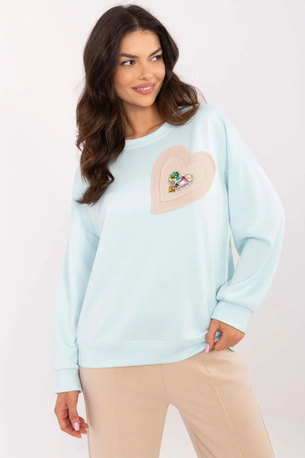 Casual dámská mikina nasazovaná přes hlavu, spojující pohodlí s jemnou elegancí. Vyrobená z měkké a příjemné směsi polyesteru, viskózy a elastanu, zajistí pohodlí po celý den. Klasický kulatý výstřih a dlouhé rukávy dělají z této mikiny univerzální kousek do šatníku, ideální na každý den. Hladký materiál jí dodává minimalistický charakter, a ozdobná nášivka ve tvaru srdce s cirkony na přední straně dodává mikině jedinečný šarm. Standardní délka umožňuje skvěle kombinovat jak s kalhotami, tak se sukněmi. Skvělá volba pro ženy, které ocení módní a pohodlný styl.