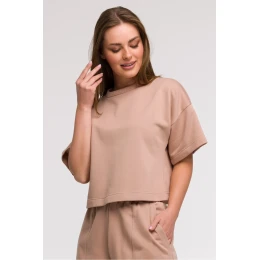 Volný dámský cropped svetr je ideální volbou pro letní každodenní stylizace. Jeho jednoduchý, boxový střih a délka sahající po pasu se skvěle kombinuje se šortkami, sukněmi nebo kalhotami s vysokým pasem. Krátký, široký rukáv a absence podšívky zajišťují prodyšnost a pohodlí při nošení v teplejších dnech. Svetr má klasický, kulatý výstřih pod krkem, který mu dodává minimalistický charakter. Navržen a ušit v Polsku s důrazem na detaily, představuje spojení pohodlí a stylu. Je skvělou základnou pro dovolenkové a městské outfity.