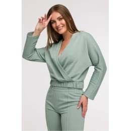 Tato dámská blůza ve stylu zavinovací sukně je kombinací pohodlí a elegance, která se skvěle hodí jak na každý den, tak během dovolené. Vyrobená v Polsku s důrazem na detaily, vyniká předním zapínáním ve tvaru písmene V, které jemně zdůrazňuje výstřih a dodává lehkost celé postavě. Střih je volný v ramenou a hrudi, a díky elastickému pásku v pasu se blůza harmonicky přizpůsobuje tělu, zdůrazňujíc ženské tvary. Tento střih způsobuje, že model vyniká zejména na postavách typu hruška, vyrovnávající poměr mezi horní a dolní částí. Délka po pas a dlouhé rukávy ji činí funkční a snadno stylizovatelnou, jak ve verzi casual, tak elegantní.