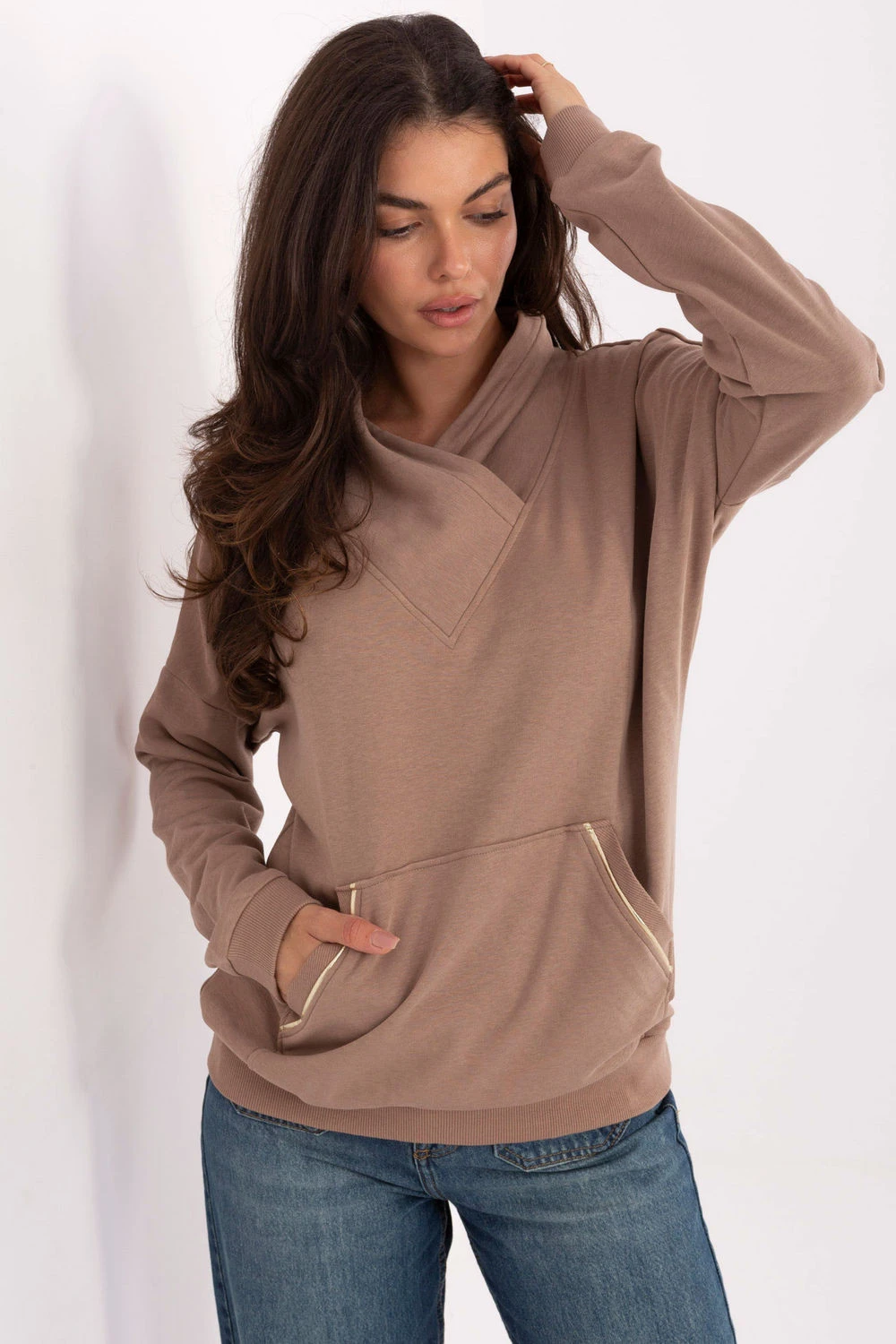Dámská mikina v casualovém stylu, ideální na každodenní příležitosti. Vyrobená z měkké a elastické směsi bavlny s elastanem, zaručuje pohodlí a volnost pohybu při zachování odolnosti materiálu. Model standardní délky má dlouhý rukáv a přeložený límeček, který dodává celek jemný charakter. Praktická kapsa typu klokani dělá z mikiny funkční a pohodlný kousek oblečení. Hladký vzor činí z ní univerzální kousek šatníku, snadno kombinovatelný s dalšími částmi každodenních stylizací, od tepláků až po džíny.
