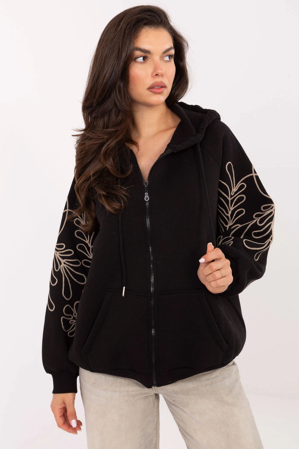 Dámská mikina s kapucí v casual stylu, ideální na každodenní příležitosti. Vyrobená z vysoce kvalitní bavlny s přídavkem elastanu, poskytuje pohodlí a pružnost. Model standardní délky s dlouhými rukávy, na kterých jsou dekorativní výšivky. Mikina má kapuci, zapíná se na zip a praktické kapsy na přední straně umožňují pohodlně schovat drobnosti. Lehce podšívaná, skvěle se hodí do casual stylizací.
