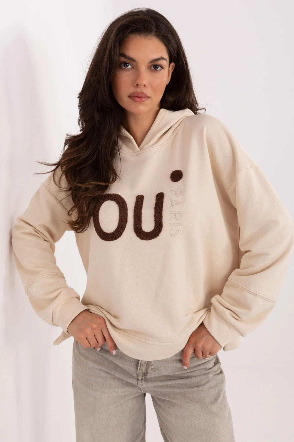 Casual dámská mikina standardní délky, ideální na každodenní stylizace. Vyrobená z vysoce kvalitní bavlny s příměsí polyesteru, je měkká, příjemná na dotek a odolná. Model s dlouhým rukávem a praktickou kapucí. Přední stranu zdobí moderní vyšívání a nápisy, které mikině dodávají charakter a originalitu. Po stranách, dole, jsou jemné rozparky, které zvyšují pohodlí nošení a dodávají moderní vzhled. Skvělá volba na každý den spojuje pohodlí, funkčnost a módní design.