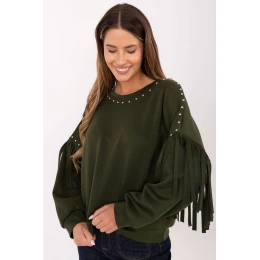 Dámská volně střižená blůza v hladkém provedení je stylovým návrhem na každý den. Vyrobená z měkké směsi viskózy a polyesteru poskytuje pohodlí a pohodlí po celý den. Klasický, kulatý výstřih byl ozdoben decentními nýty, které celku dodávají moderní charakter. Dlouhý rukáv s efektními šňůrkami a aplikací nýtů dělá z blůzy výrazný prvek každodenních outfitů. Standardní délka a absenci zapínání ji dělají praktickým, ale zároveň originálním kouskem šatníku.