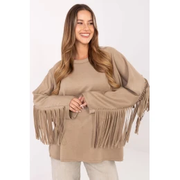 Dámská mikina s ležérním charakterem, vytvořená s ohledem na každodenní stylizace. Vyrobená z kombinace viskózy a polyesteru, z materiálu typu měkkého másla, jemného a neuvěřitelně příjemného na dotek. Hladká struktura jí dodává univerzálnost, zatímco standardní délka a klasický, kulatý výstřih zaručují, že se skvěle přizpůsobí postavě. Dlouhé rukávy jsou zdobeny frčlíky a nýtky, které celku dodávají výrazný charakter. Frčlíky se vyskytují i na zádech, zdůrazňujíce originální, moderní styl mikiny. Je to ideální volba pro ženy, které ocení pohodlí spojené s módním detail.