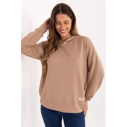 Elegantní dámská mikina s ležérním charakterem, ideální na každý den. Vyrobená z příjemné směsi viskózy, polyesteru a elastanu, poskytuje pohodlí nošení, pružnost a odolnost. Model s standardní délkou, dlouhým rukávem a kapucí je klasikou v moderním provedení. Hladký materiál dělá mikinu univerzální a snadno kombinovatelnou, zatímco ozdobné nášivky na spodním lemě a na kapuci jí dodávají originální, módní akcent. Bez zapínání zaručuje volnost a pohodlí při nošení. Ideální ke kalhotám, legínám nebo teplákovým kalhotám, skvělý návrh na každodenní, volné styly.