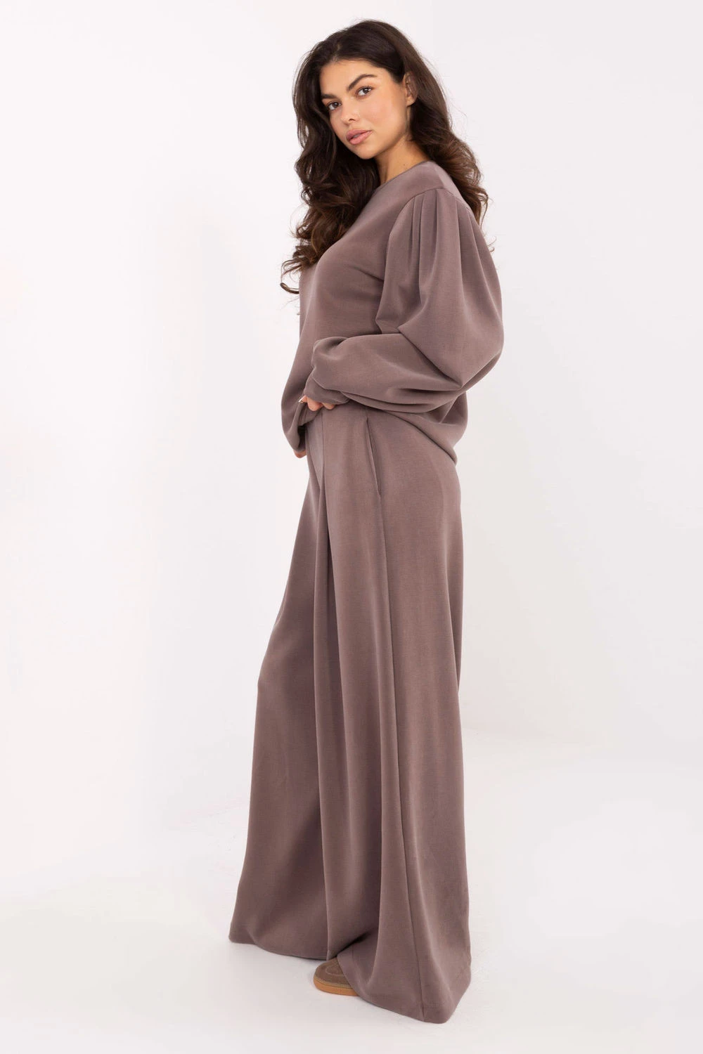 Tato dámská mikina je kvintesencí pohodlí a ženského stylu v každodenním provedení. Vyrobena z jemného, měkkého a mimořádně příjemného materiálu typu máslo, poskytuje nepřekonatelný komfort a pocit zahalení po celý den. Mikina má ležérní charakter a hladký vzor, díky čemuž se skvěle hodí do mnoha každodenních stylizací, od volných outfitů s džínami po elegantnější kombinace s látkovými kalhoty nebo sukní. Model standardní délky s kulatým výstřihem a dlouhými rukávy vypadá žensky a decentně. Dalším akcentem jsou nafouklé rukávy, které mikině dodávají lehkost a módní charakter. Absence zapínání zdůrazňuje její jednoduchost a pohodlnost užívání.