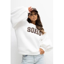 Elegantní dámská mikina s casual charakterem, ideální pro každodenní pohodlné stylizace. Vyrobená z měkké směsi bavlny s elastanem, poskytuje pohodlí nošení a dobře padne k postavě. Model má standardní délku, dlouhý rukáv a klasický kulatý výstřih. Mikina se vyznačuje efektním vertikálním rozřezem na zádech, který jí dodává moderní a originální charakter. Na přední straně je našitý nápis sloužící jako módní akcent. Vypasovaný rukáv dodává celku lehkost a ženský styl, a lehké zateplení z ní dělá skvělý kousek i na chladnější dny. Model bez zapínání, pohodlný a ideální k nošení každý den.