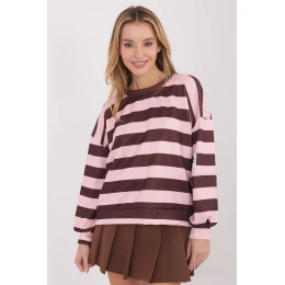 Stylový dámský mikina s casual charakterem, ideální na každý den. Vyniká módním pruhovaným vzorem, který jí dodává moderní a univerzální vzhled. Vyrobená z příjemné viskózy s přídavkem elastanu, díky čemu je měkká, pružná a pohodlná na nošení po celý den. Model standardní délky s dlouhým rukávem a kulatým výstřihem, který klasicky padá na postavě. Mikina nemá zapínání, co zdůrazňuje její volný styl a pohodlí nošení. Další výhodou je dekorativní nášivka na rukávu, která celku dodává originální charakter. Skvěle se hodí do každodenních stylizací, jak s džíny, tak s látkovými kalhotami nebo legíny.
