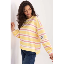 Stylová dámská mikina s casual charakterem, ideální na každý den. Vyniká módním pruhovaným vzorem, který jí dodává moderní a univerzální vzhled. Vyrobená z příjemné viskózy s přídavkem elastanu, díky čemuž je měkká, pružná a pohodlná na nošení po celý den. Model má standardní délku, dlouhý rukáv a kulatý výstřih, který klasicky padá podle siluety. Mikina nemá zapínání, co zdůrazňuje její volný styl a pohodlí nošení. Další výhodou je dekorativní nášivka na rukávu, která dodává celku originální charakter. Skvěle se hodí do každodenních stylizací, jak s džíny, tak s látkovými kalhotami nebo legíny.