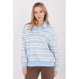 Dámská mikina Casual s nadčasovým a univerzálním stylem, ideální pro každodenní outfit. Model se vyznačuje módním pruhovaným vzorem, který dodává celku svěžest a lehce sportovní charakter. Mikina je vyrobena z vysoce kvalitní viskózy s přídavkem elastanu, co zajišťuje měkkost, pružnost a vysoký komfort nošení. Střih standardní délky s dlouhým rukávem se dobře přizpůsobuje postavě a bude vhodný po celou sezónu. Zapínání na knoflíky vpředu typu polo ve spojení s klasickým límečkem dává mikině elegantní a zároveň volný vzhled. Je to skvělý návrh pro ženy, které oceňují pohodlí spojené s propracovanými detaily. Mikina skvěle ladí s džínami, látkovými kalhotami nebo sukní, vytvářející stylové sestavy na každý den.