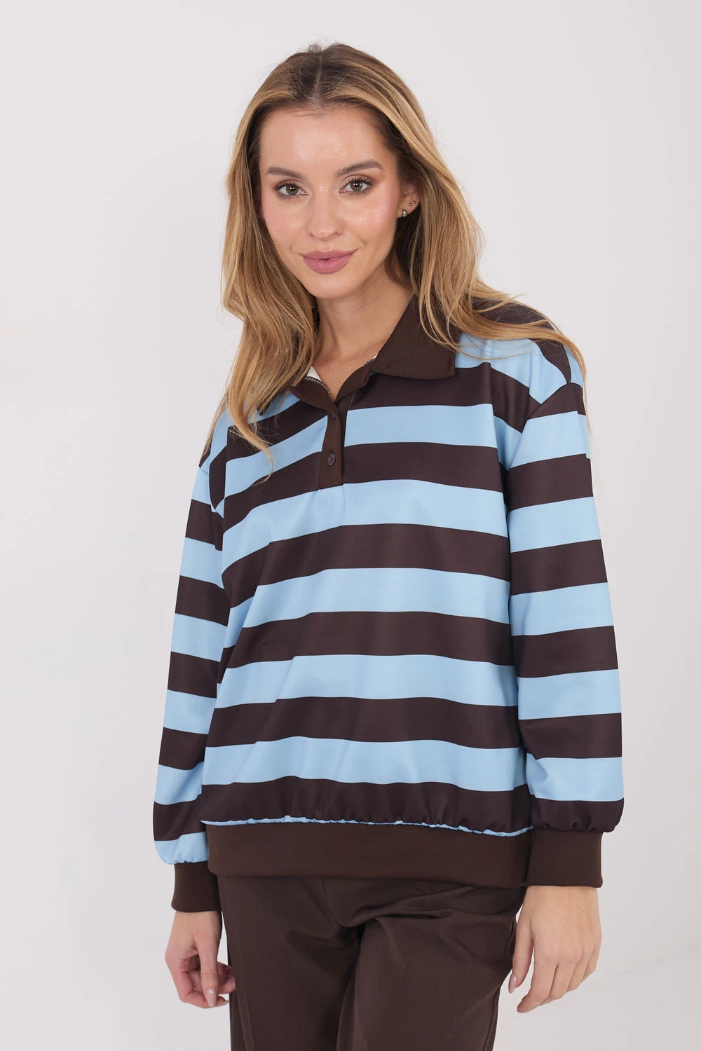Casualový dámský svetr s nadčasovým a univerzálním stylem, ideální pro každodenní outfit. Model se vyznačuje módním pruhovaným vzorem, který dodává celku svěžest a lehce sportovní charakter. Svetr je vyroben z vysoce kvalitní viskózy s přídavkem elastanu, co zajišťuje měkkost, pružnost a vysoký komfort nošení. Střih s standardní délkou a dlouhým rukávem krásně padne na postavě a osvědčí se po celou sezónu. Zapínání na knoflíky vpředu typu polo spolu s klasickým límečkem dodává svetru elegantní a zároveň volný vzhled. Je to skvělý návrh pro ženy, které oceňují pohodlí spojené s propracovanými detaily. Svetr skvěle ladí s džíny, látkovými kalhotami nebo sukní, vytvářející stylové outfit na každý den.